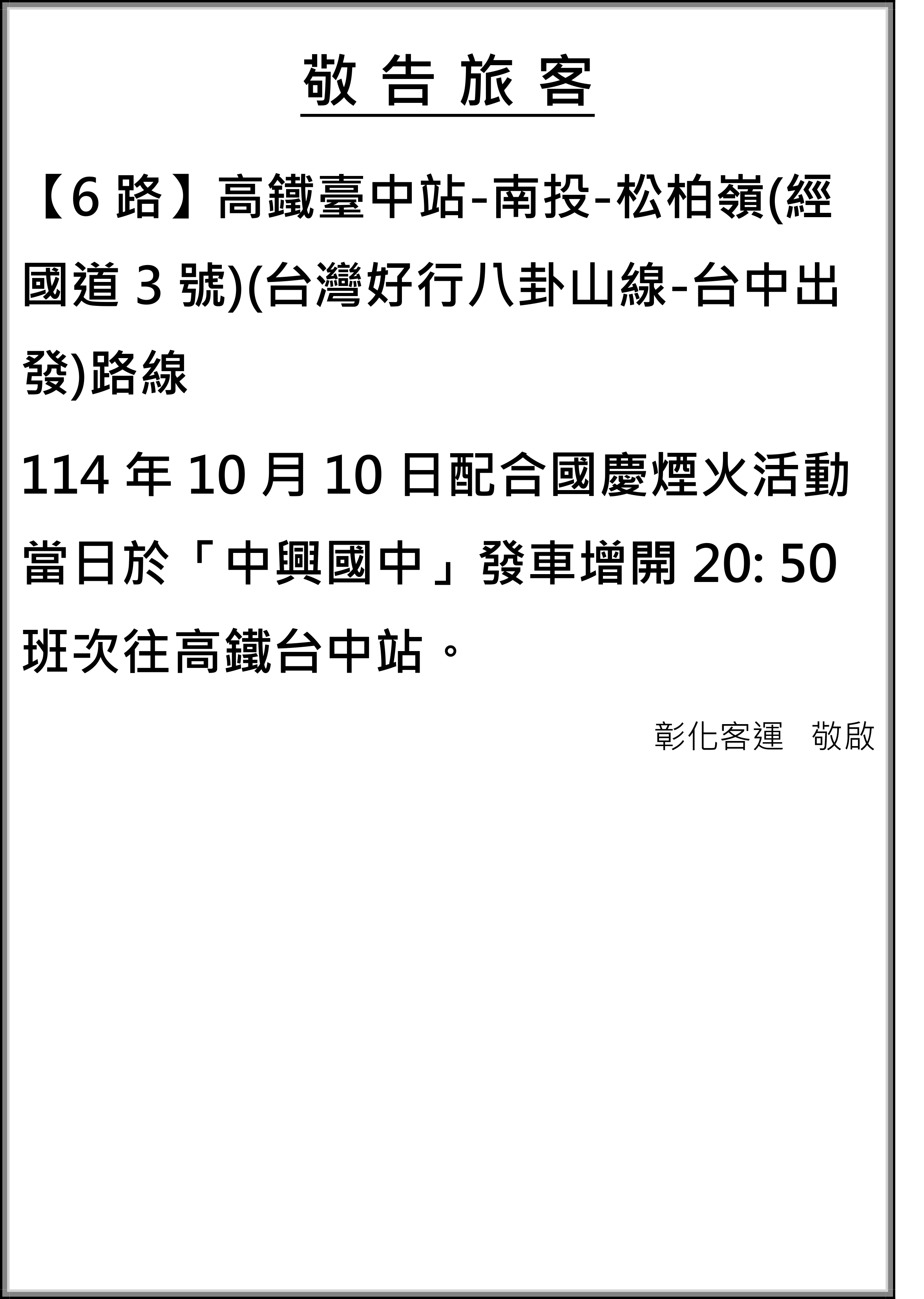【活動】南投6路路線,10/10期間配合國慶煙火,增開班次