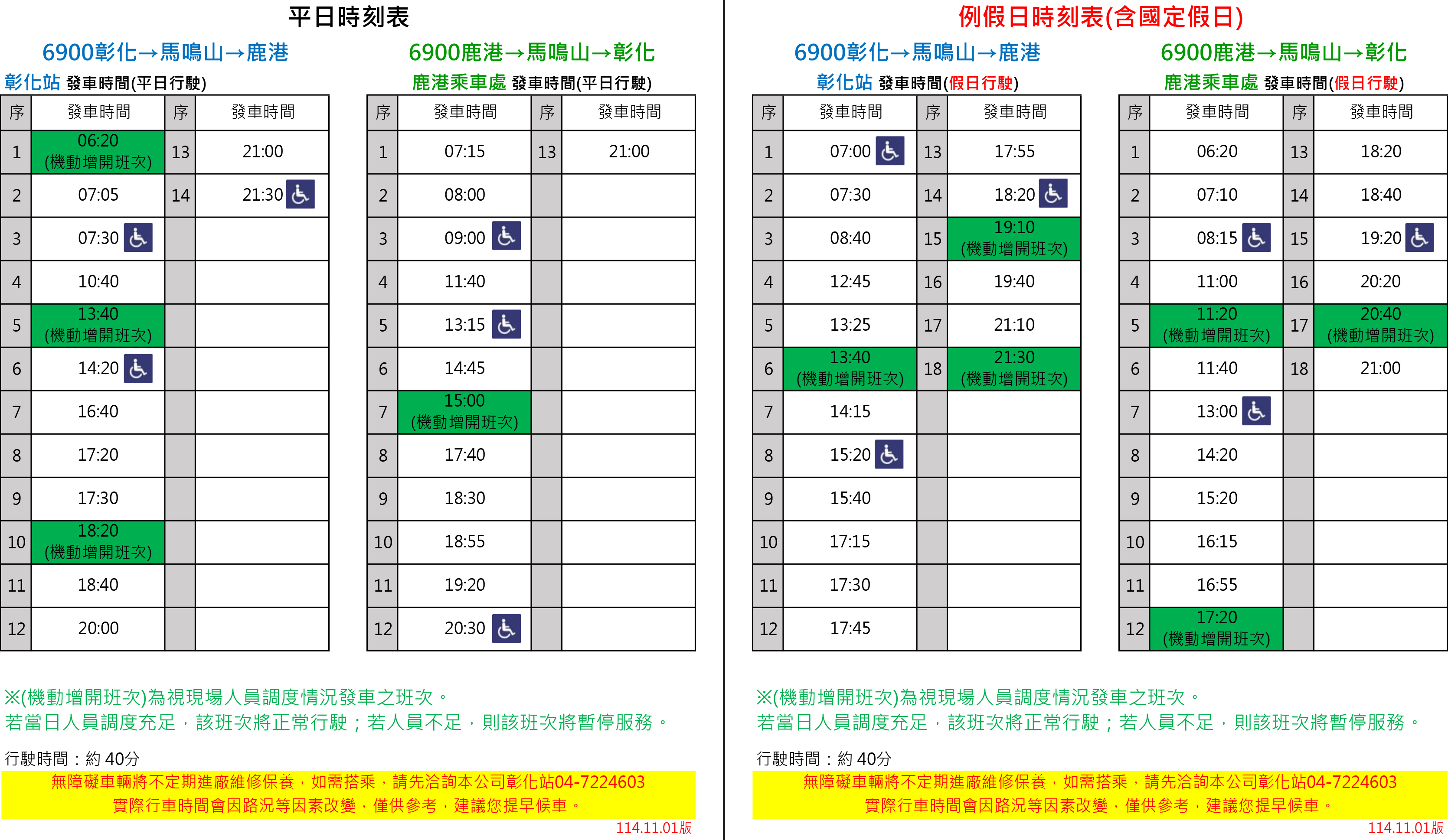 敬告旅客,本路線將於114/11起機動增開班次,修改後時刻表如下: