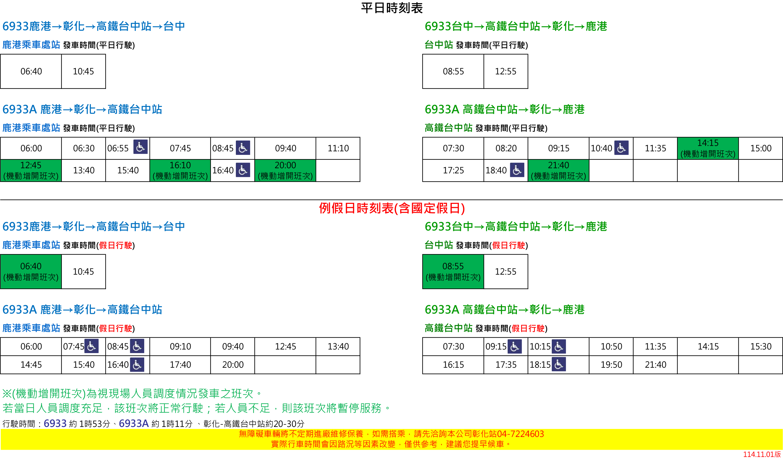 敬告旅客,本路線將於114/11起機動增開班次,修改後時刻表如下:
