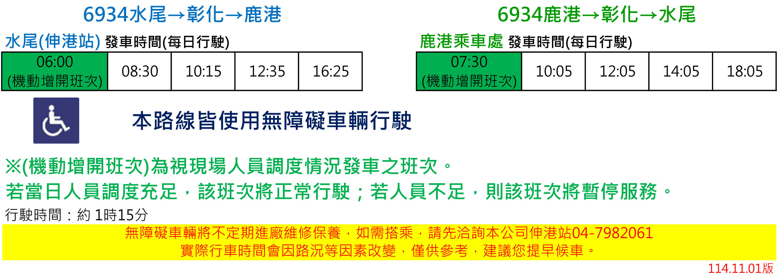 敬告旅客,本路線將於114/11起機動增開班次,修改後時刻表如下: