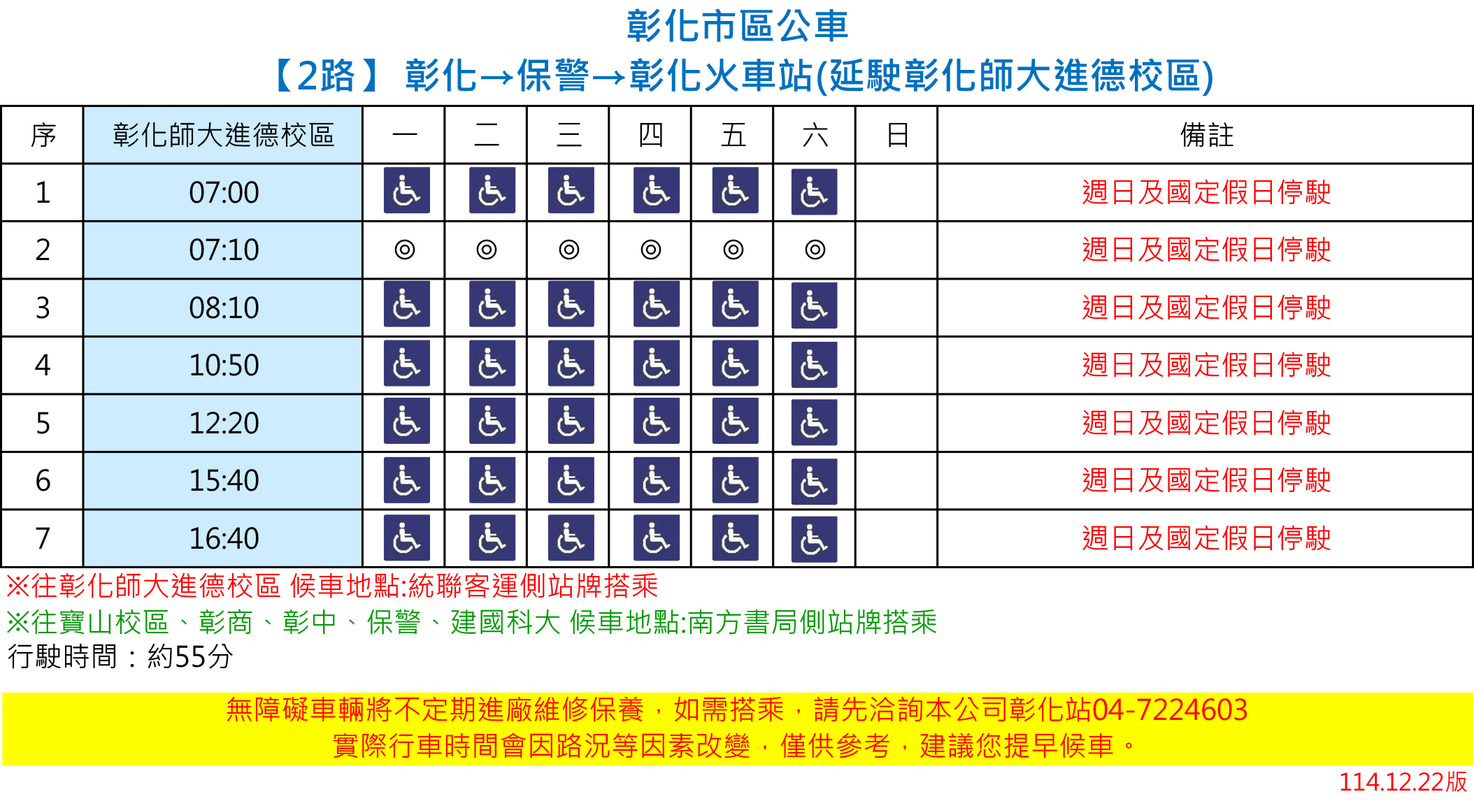 ※市公車2路自111年3月21日起,部分班次調整起訖於彰化師大進德校區,原彰化站(三民路)候車地點異動,等搭乘民眾留意前往方向。